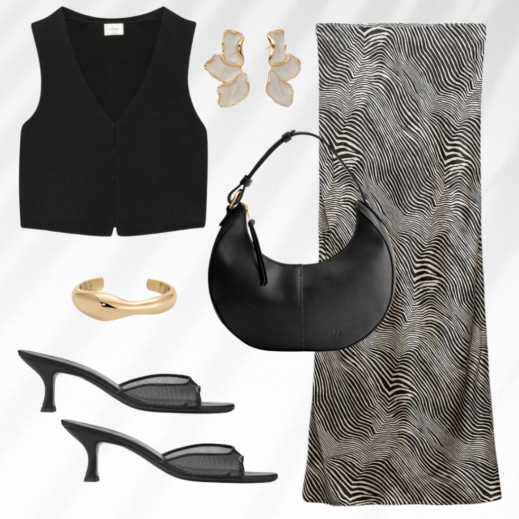This outfit is a chic combo of edgy and glam, featuring a sleek black top paired with a bold animal print midi skirt. The look is elevated with black mesh mules, a statement gold cuff, and eye-catching earrings that add just the right amount of sparkle. Perfect for date nights or a stylish day out, this outfit is all about confidence and effortless flair!