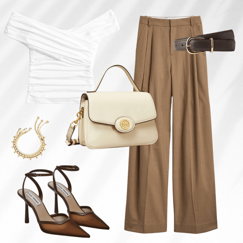 Elevate your wardrobe with this chic and versatile ensemble featuring high-waisted brown pleated trousers paired with an elegant off-shoulder white ruched top. Accessorized with a sleek leather belt, a sophisticated cream handbag, and classic gold bracelets, this outfit exudes effortless sophistication. Complete the look with open-back brown kitten heels for a polished style perfect for work or a casual evening outing.