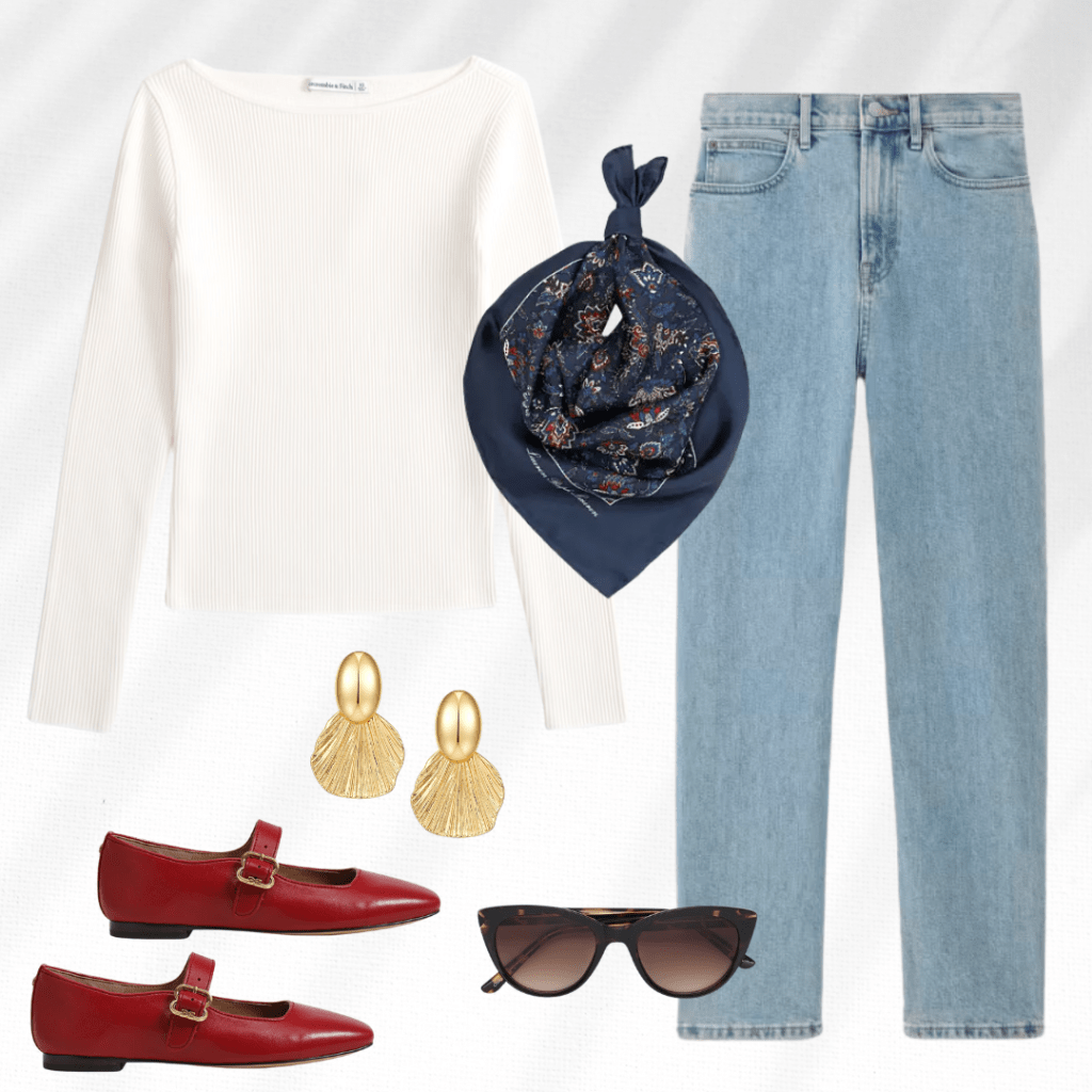 This outfit exudes a timeless and elegant charm, combining a ribbed cream long-sleeve top with light-wash straight-leg jeans for a casual yet polished base. The navy blue paisley-patterned silk scarf and gold shell earrings bring a refined, artistic touch, while the red Mary Jane flats add a bold, playful pop of color. Finishing the look, tortoiseshell cat-eye sunglasses provide a retro flair, tying the ensemble together seamlessly.