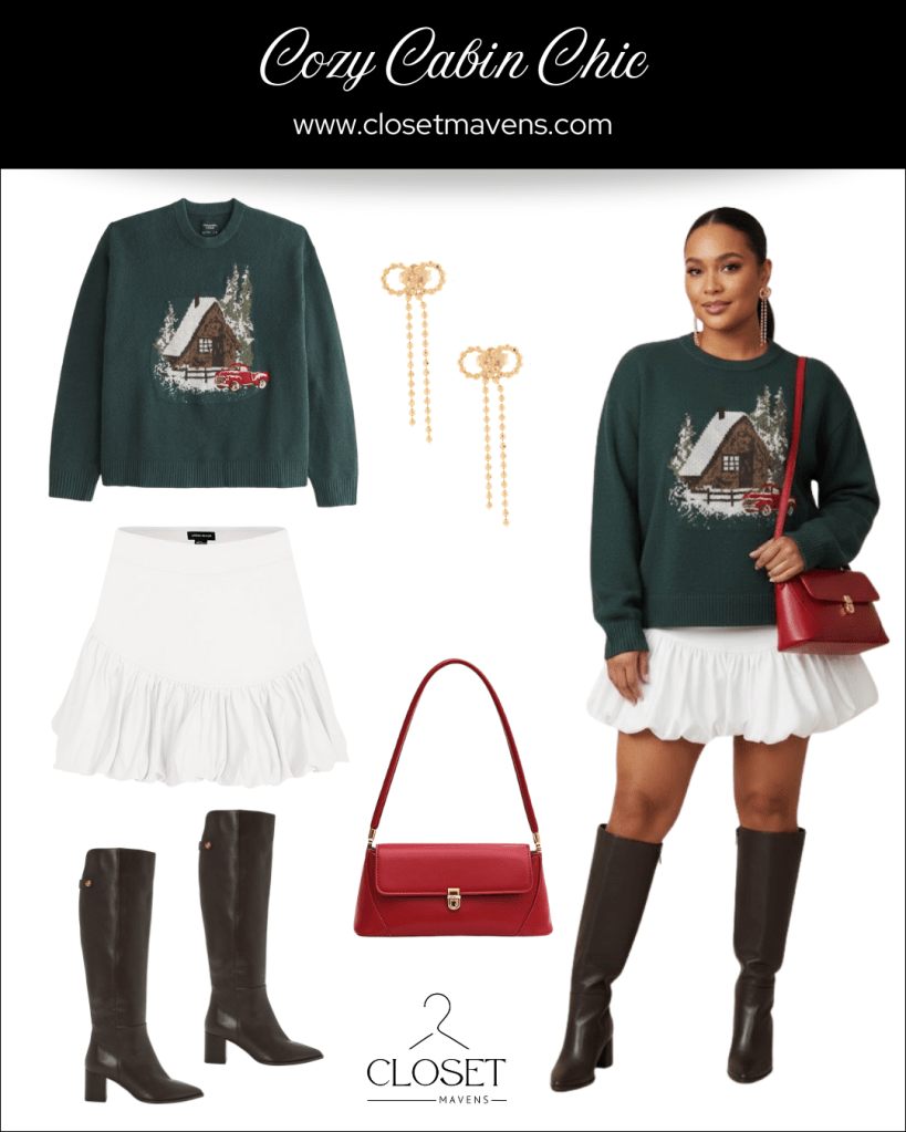 This look is perfect for a festive holiday gathering, blending comfort with flirty style. It features a deep forest green, oversized sweater with a picturesque snowy cabin graphic, worn untucked to reveal a playful, white bubble mini-skirt peeking out from beneath. The outfit is grounded by tall, dark brown knee-high boots and accessorized with a vibrant red shoulder bag, adding a bold pop of color that echoes the traditional holiday palette.